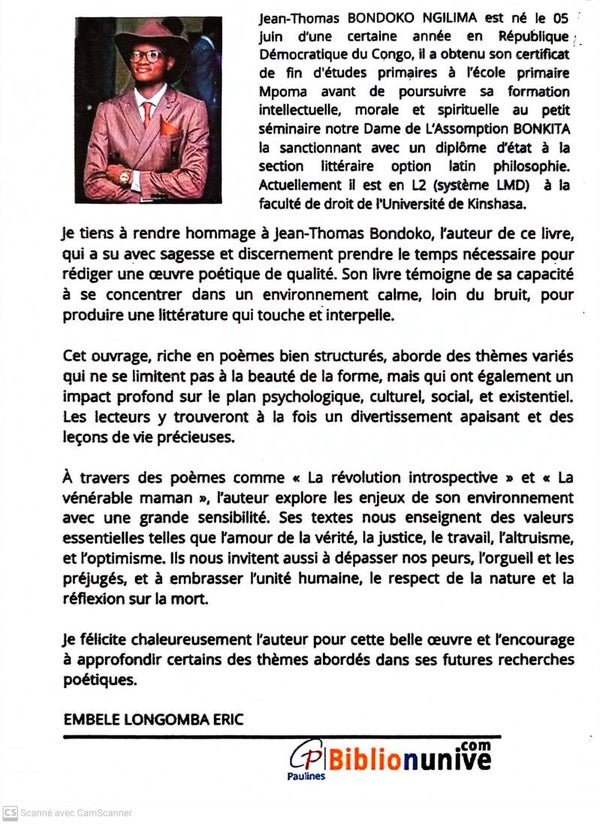 Receuil des 32 poèmes de l'auteur Jean Thomas BONDOKO, étudiant en faculté de droit de l'université de Kinshasa, répartis en 5 thématiques.